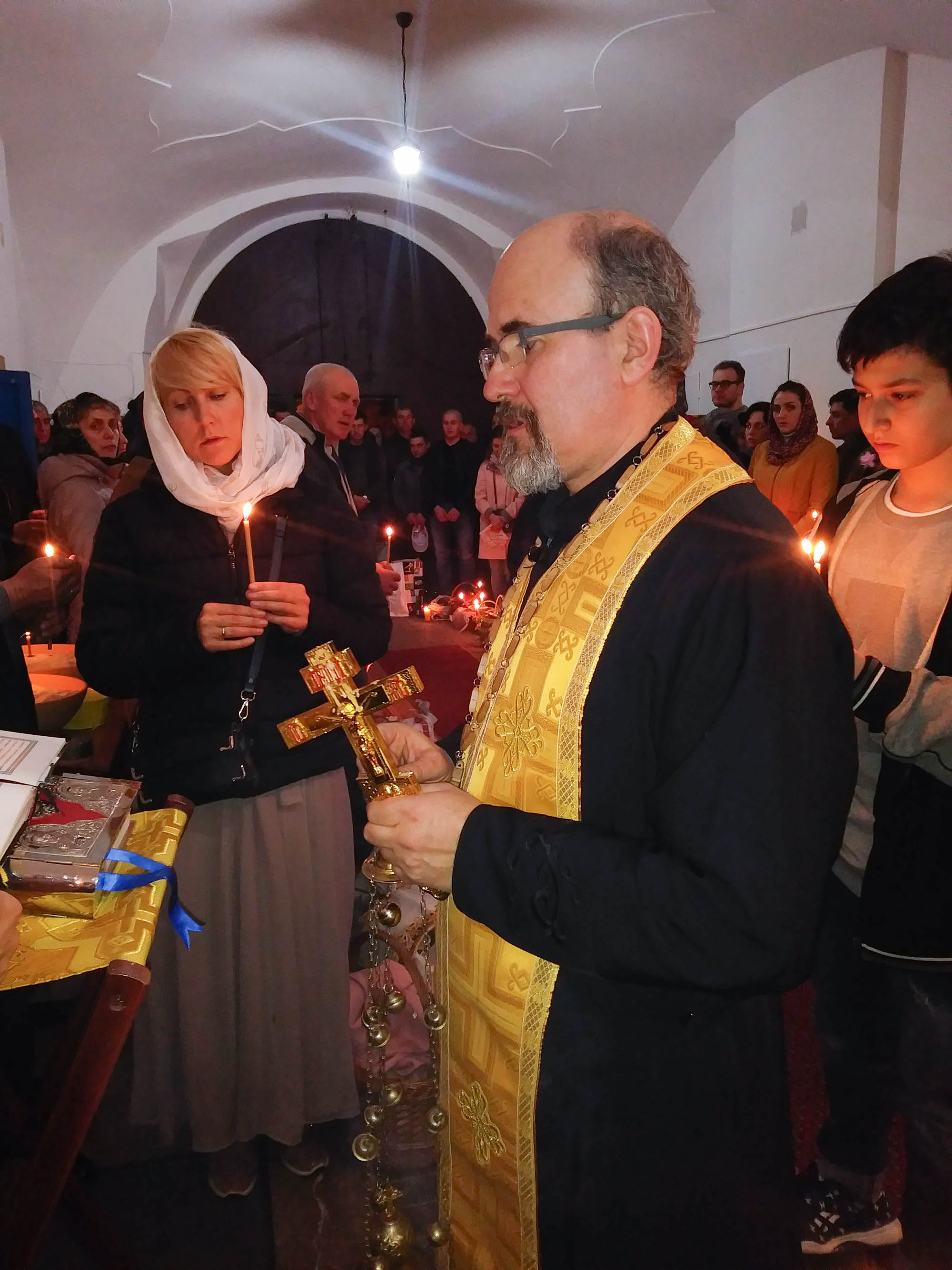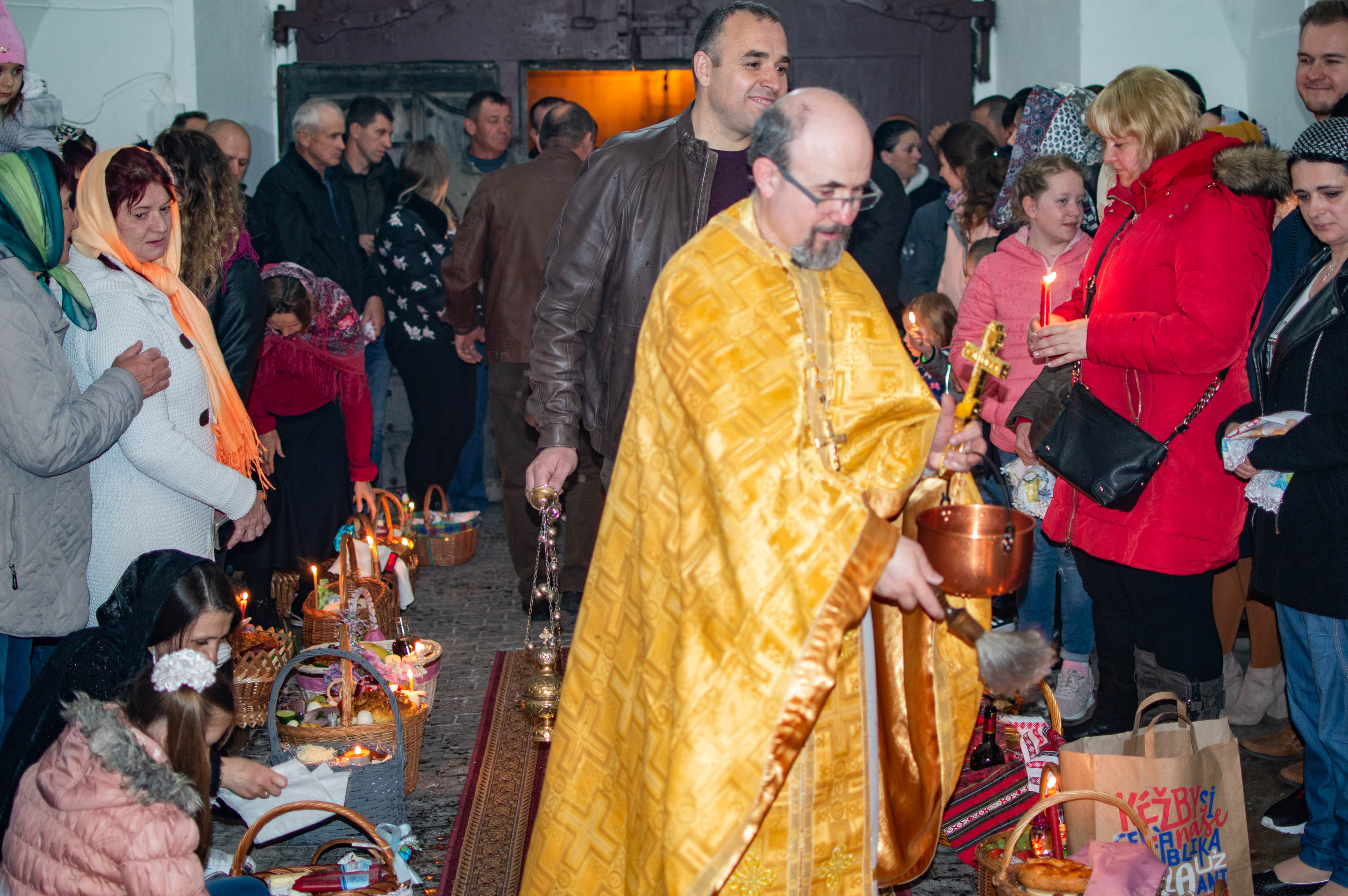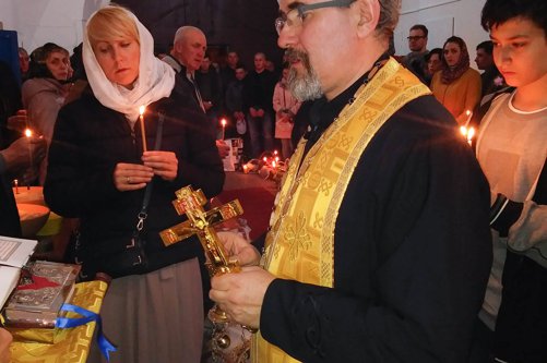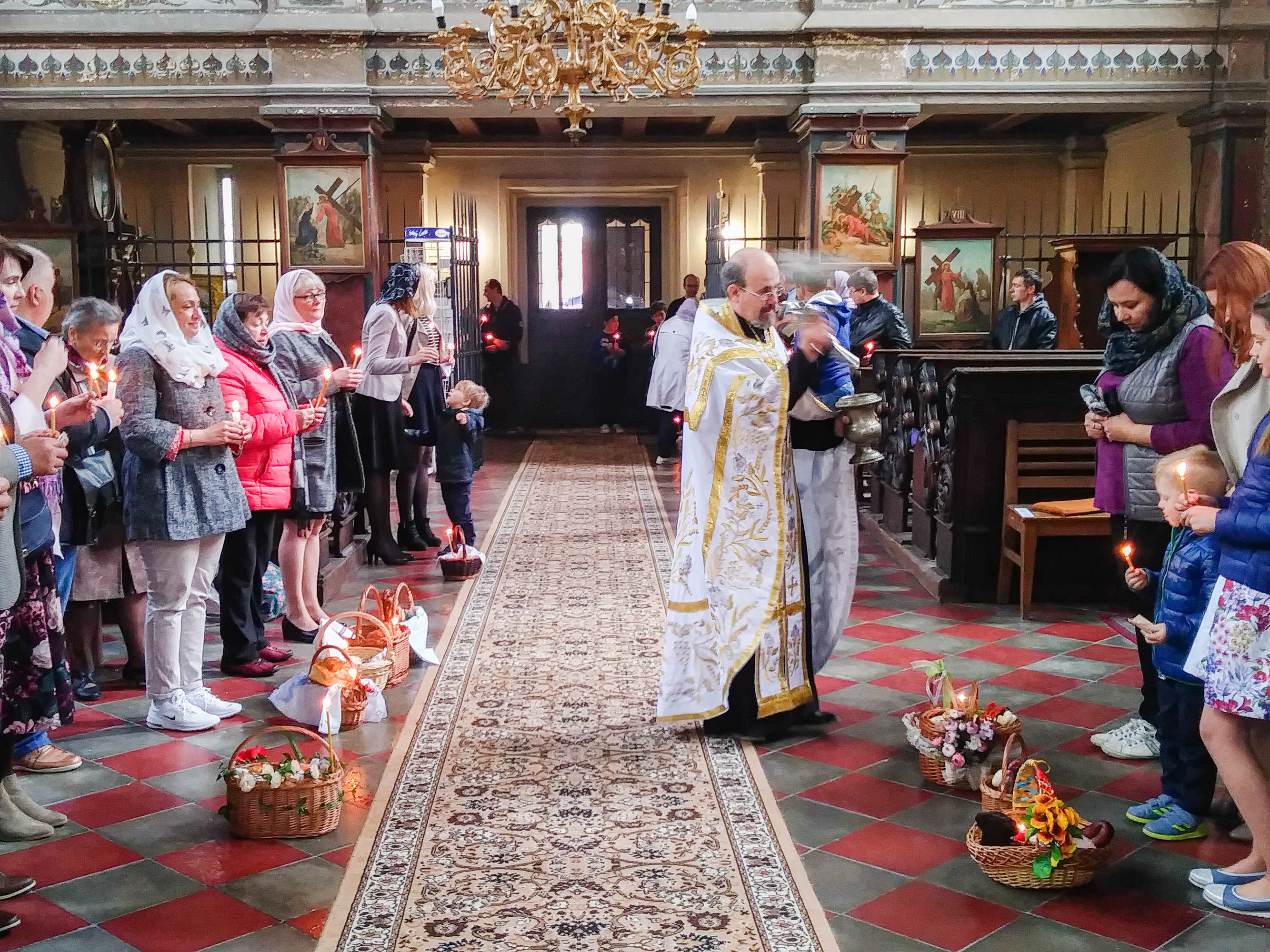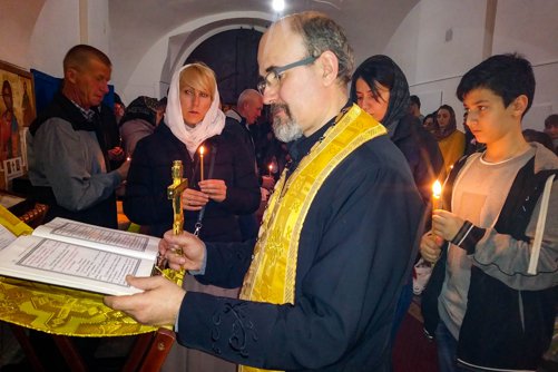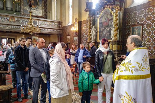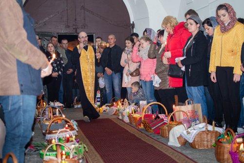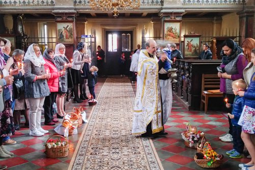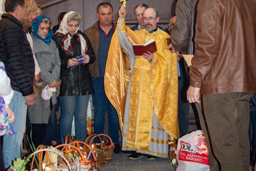 Oslavy Zmrtvýchvstání našeho Pána Ježíše Krista jsme započali již v sobotu večer čtením skutků sv. Apoštolů před Božím hrobem. Poté následoval slavnostní průvod s rozžehnutými svícemi kolem náměstí sv. Václava, po kterém následovala Paschální jitřní s čtením ze sv. Evangelia přede dveřmi chrámu. Od začátku jitřní se začal všude rozléhat zpěv troparu Christos voskrese, který nám připomínal radostnou zvěst o Zmrtvýchvstání našeho Spasitele. Po jitřní otec Konstantin požehnal Paschální pokrmy, které věřící přinesli. Poté se během Paschální svaté liturgie ti, kteří se během půstu na tento velký den připravovali, sjednotili s naším Spasitelem Ježíšem Kristem ve sv. Eucharistii.