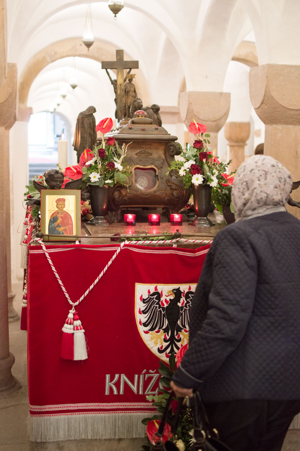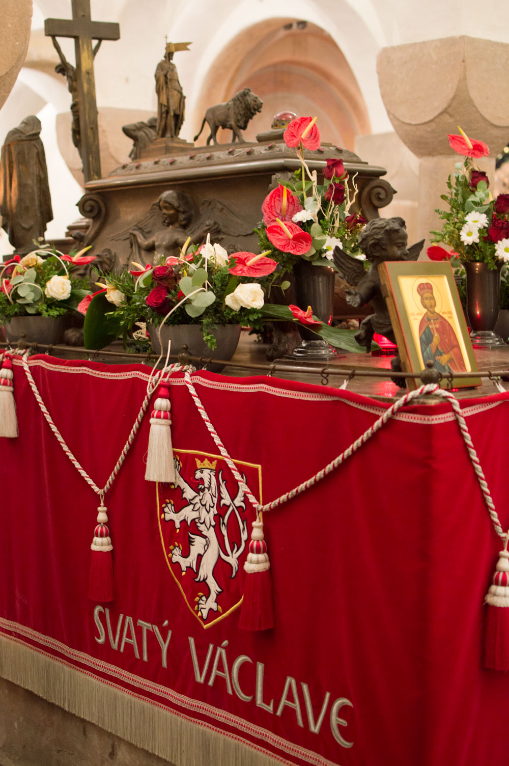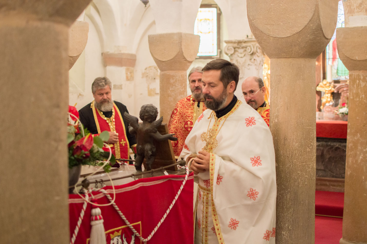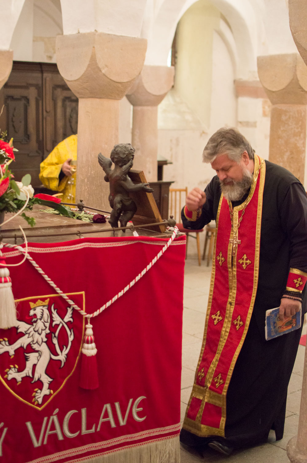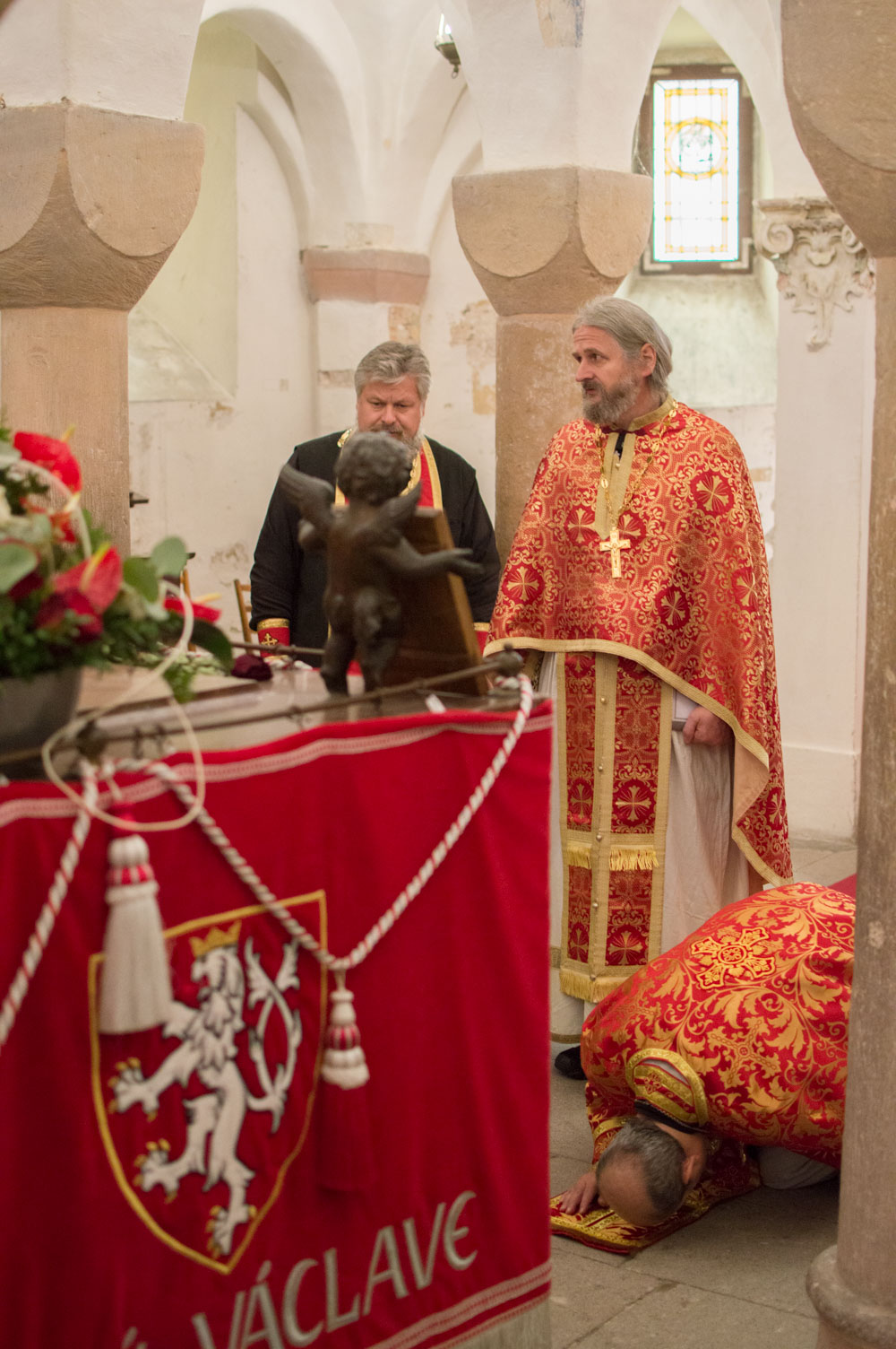 Poutní sv. Liturgie se konala v chrámu sv. Klimenta, kde se již druhým rokem pravidelně slouží pravoslavné bohoslužby. Po liturgii jsme se odebrali do vedlejšícho kostela sv. Václava, kde jsme se v kryptě sv. Kosmy a Damiána poklonili hrobu sv. Václava.