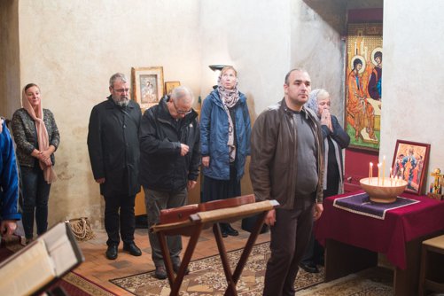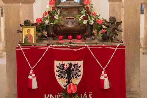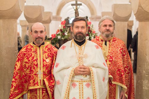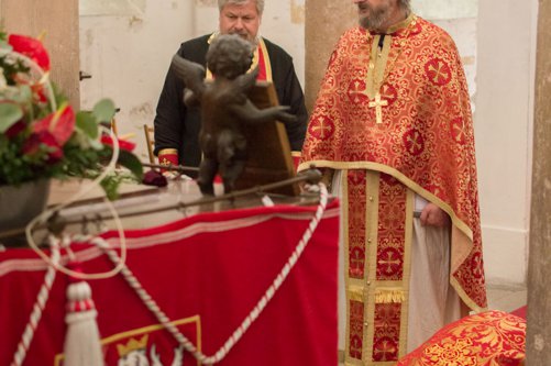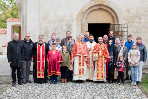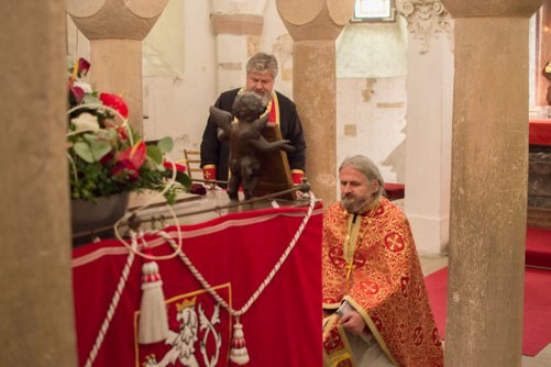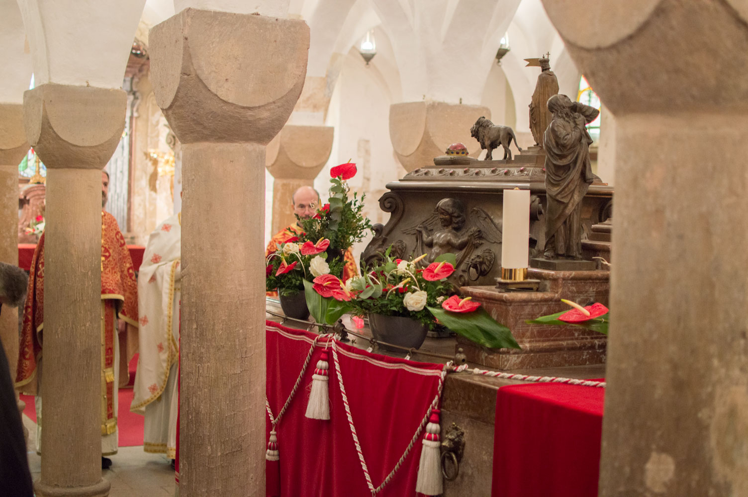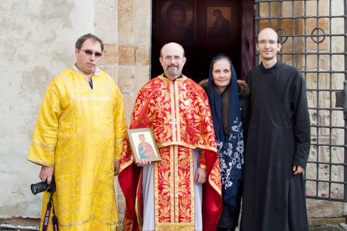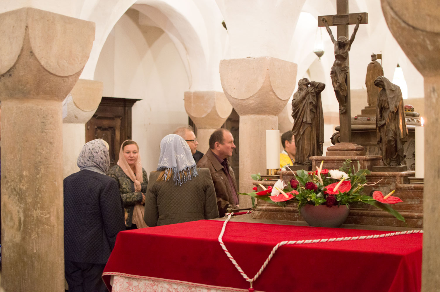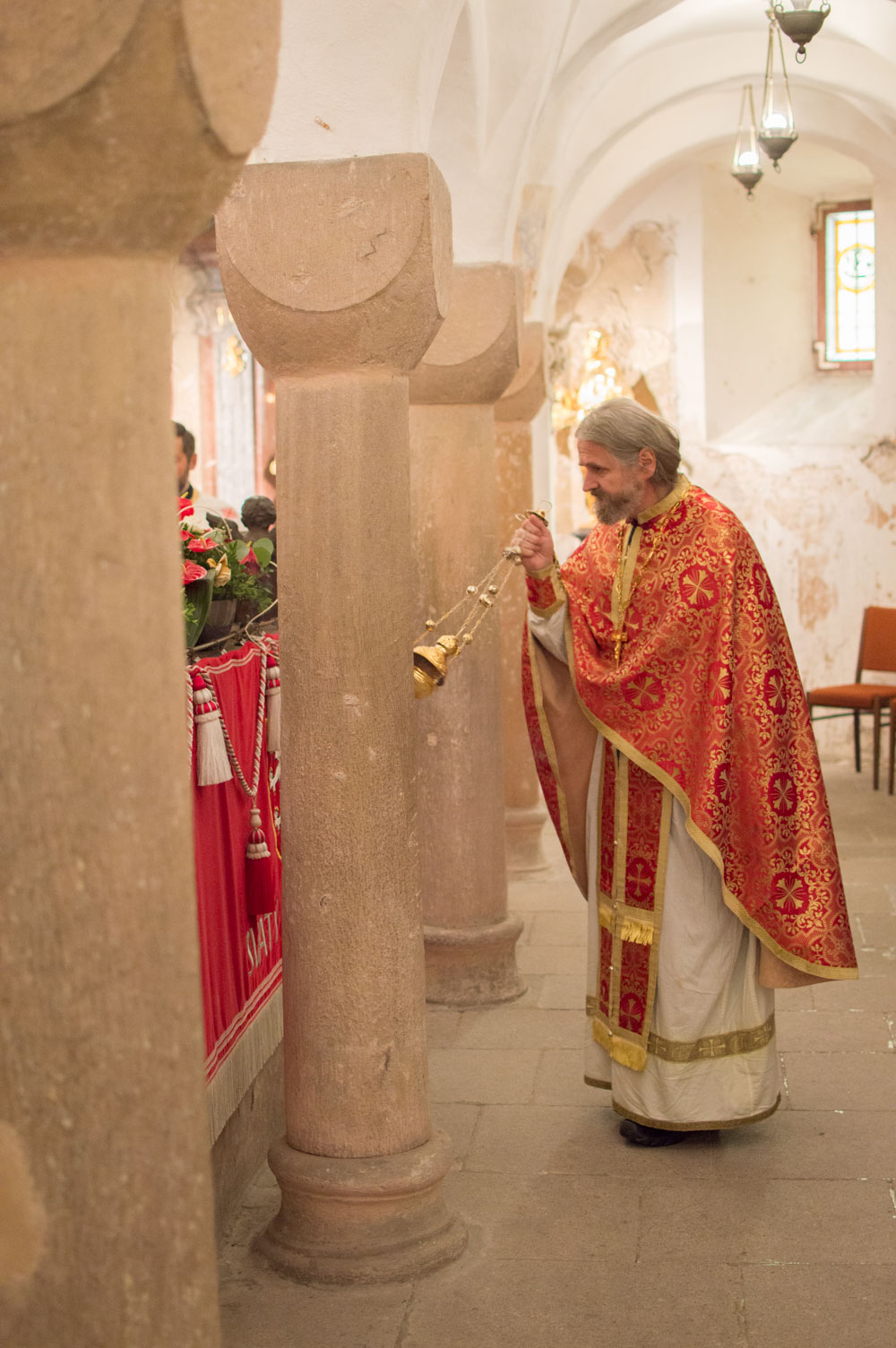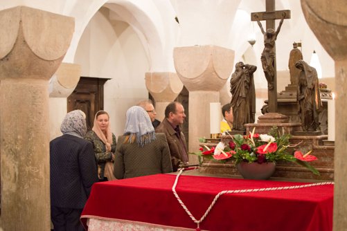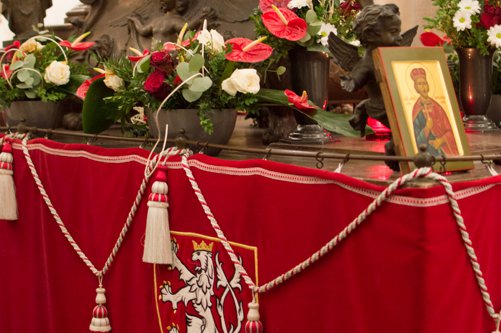 Poutní sv. Liturgie se konala v chrámu sv. Klimenta, kde se již druhým rokem pravidelně slouží pravoslavné bohoslužby. Po liturgii jsme se odebrali do vedlejšícho kostela sv. Václava, kde jsme se v kryptě sv. Kosmy a Damiána poklonili hrobu sv. Václava.