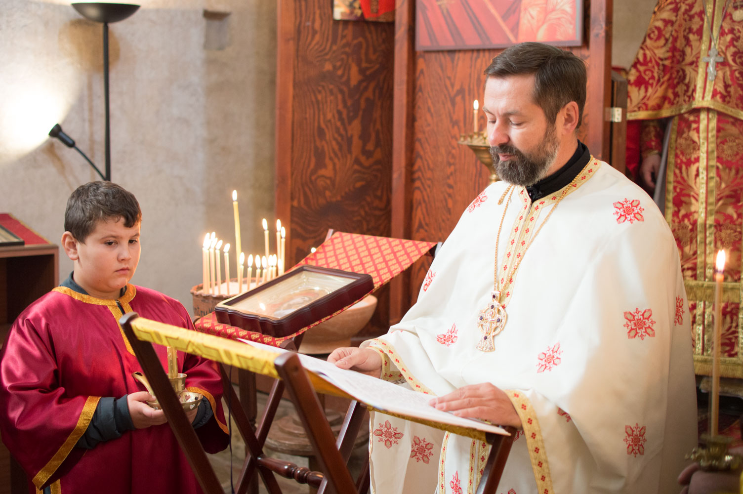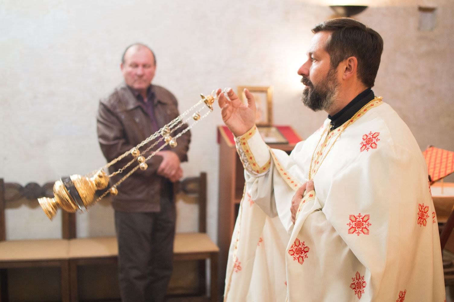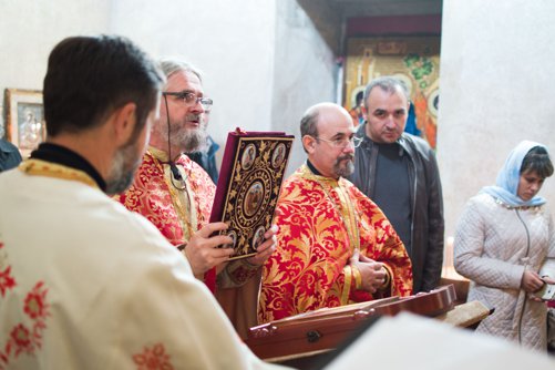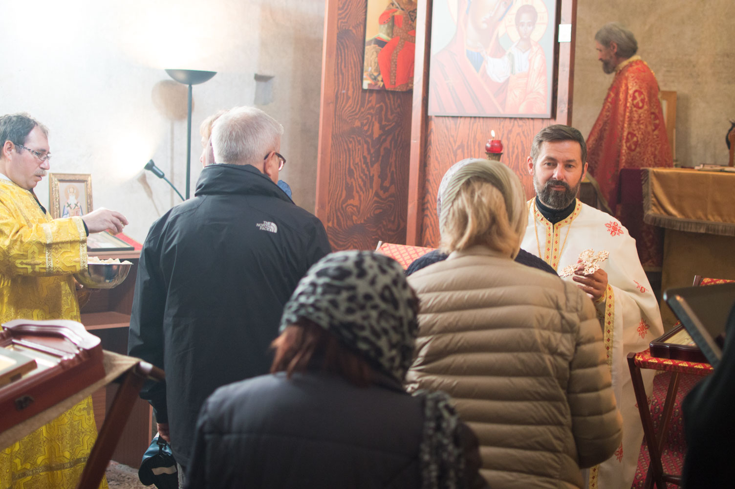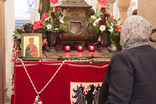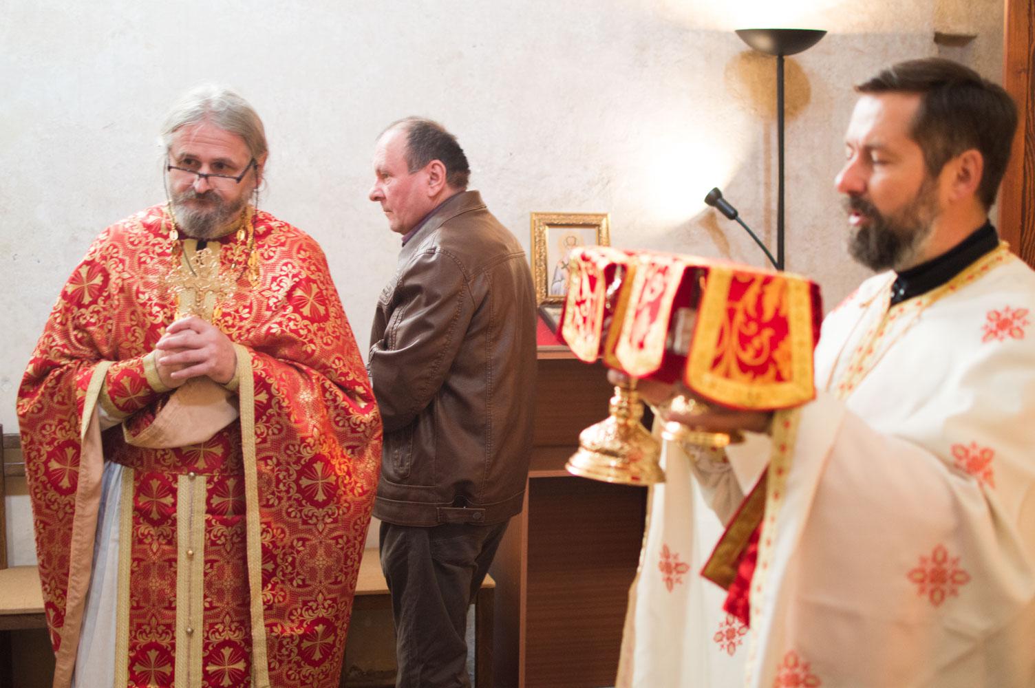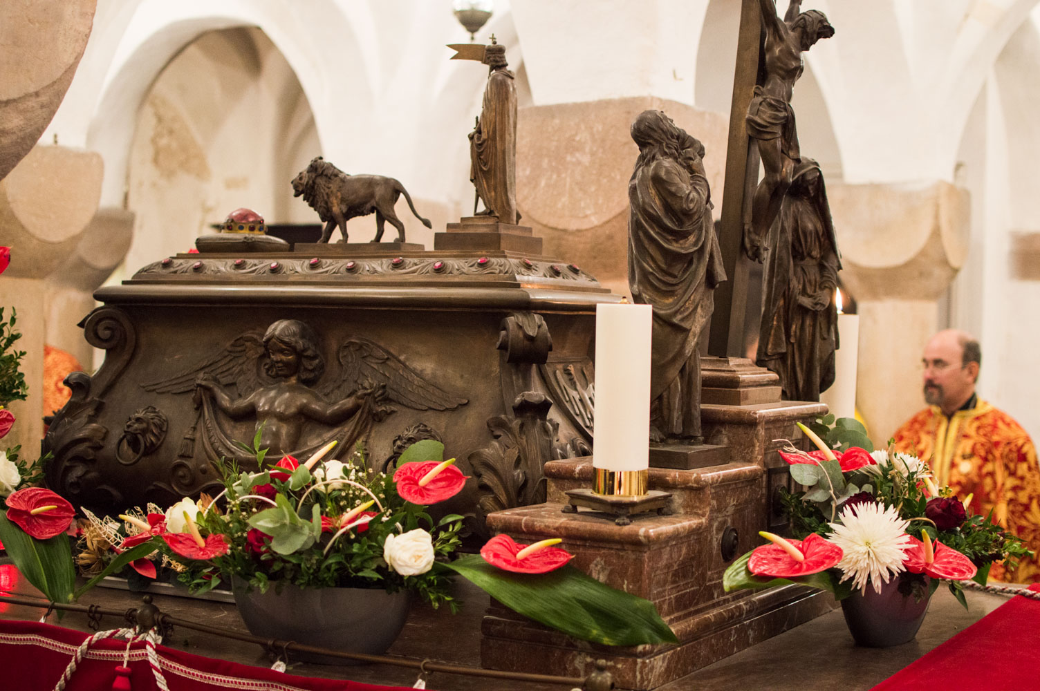 Poutní sv. Liturgie se konala v chrámu sv. Klimenta, kde se již druhým rokem pravidelně slouží pravoslavné bohoslužby. Po liturgii jsme se odebrali do vedlejšícho kostela sv. Václava, kde jsme se v kryptě sv. Kosmy a Damiána poklonili hrobu sv. Václava.